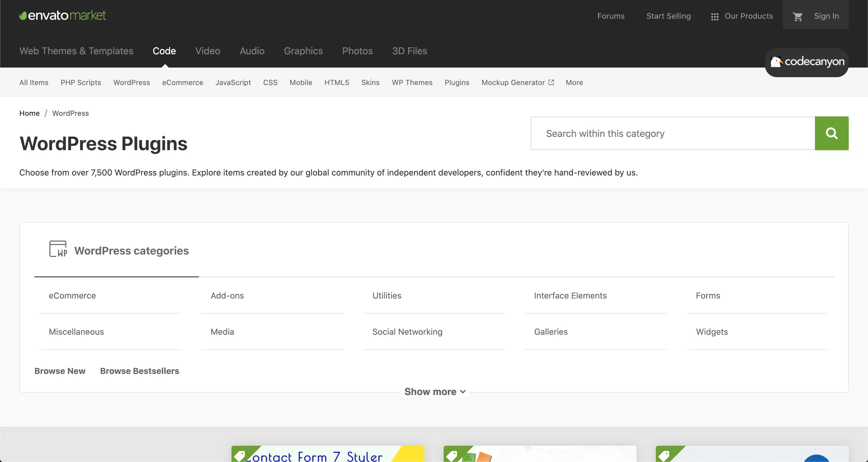 Attention bien entendu à bien vous rendre dans la catégorie WordPress du site CodeCanyon ! Ensuite, un peu de la même façon que dans le répertoire officiel de WordPress, vous pourrez explorer les catégories de fonctionnalités ou taper directement le plugin dans la barre de recherche.