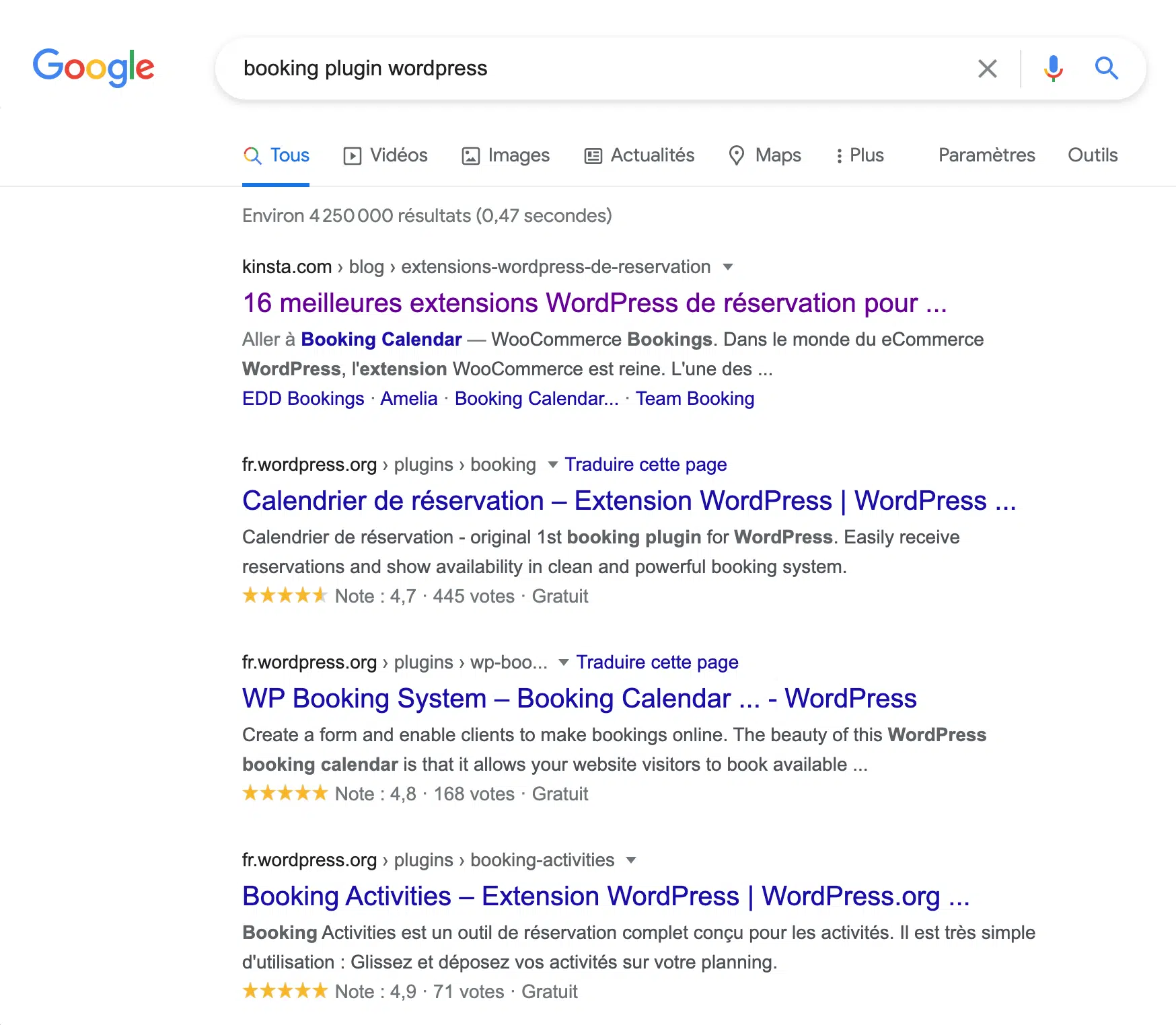 Par exemple, si je cherche un plugin pour faire de la réservation en ligne, je pourrai essayer de taper : booking plugin wordpress.